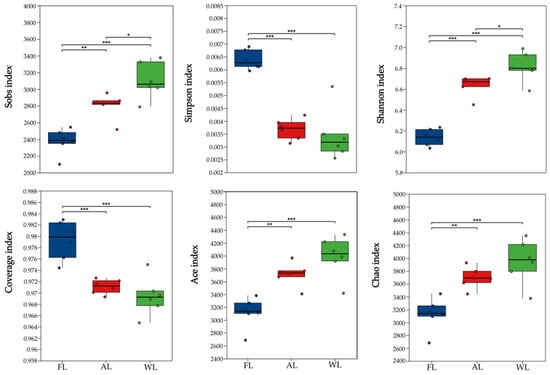 Diversity index of soil bacterial communities in different land use patterns. * p < 0.05; ** p < 0.01; and *** p < 0.001. Abbreviations: FL, forestland. AL, arable land. WL, wetland.