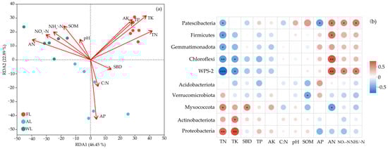 Environmental factor correlation analysis. The redundancy analysis (RDA, (a)) and heat map (b) of the soil bacterial community at the OTU level. * p < 0.05, ** p < 0.01, and *** p < 0.001. Abbreviations: pH, soil pH values. SOM, soil organic matter. SBD, Soil bulk density. TN, total nitrogen. TP, total phosphorus. TK, total potassium. AN, available nitrogen. AP, available phosphorus. AK, available potassium. C:N, the ratio of total C and total N. NO3−-N, nitrate nitrogen. NH4+-N, ammonium nitrogen. FL, forestland. AL, arable land. WL, wetland.