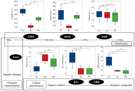 Activity of C and N cycle-related enzymes of soil under different land use patterns. ** p < 0.01, *** p < 0.001. Abbreviations: FL, forestland. AL, arable land. WL, wetland. AMO, ammonia monooxygenase activity. HAO, hydroxylamine oxidoreductase activity. NXR, nitrite oxidoreductase activity. NAG, N-acetyl-β-D-glucosaminidase activity. β-G, β-D-glucosidase activity. CBH, β-cellobiosidase activity.