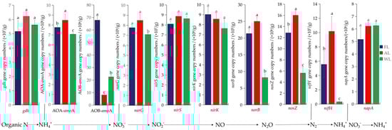 Abundance of nitrogen-cycling functional genes. Different letters above the bars indicate statistical differences among treatments at the significance level of p < 0.05. Abbreviations: FL, forestland. AL, arable land. WL, wetland.