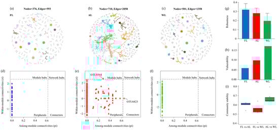 Co-occurrence network of soil bacteria dominant OTUs. Note: Network nodes and links are colored according to module properties, with large modules (≥5 nodes) shown in different colors and smaller modules shown in gray. Abbreviations: FL, forestland. AL, arable land. WL, wetland. (a–c), co-occurrence network. (d–f), the network topology parameters. (g–i), the soil bacteria dominant OTUs analysis for robustness, vulnerability, and community stability analysis.
