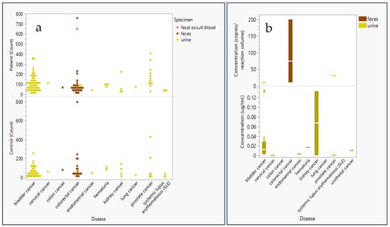 Sample size and concentration of genomic material used in epigenetic panel studies employing liquid biopsy materials. (a) Patient and control count (sample size) in epigenetic panel screening studies * are plotted as a function of specimen type: urine (yellow), feces (brown), and fecal occult blood (pink). (b) Genetic (DNA or RNA) concentration analyzed for epigenetic markers in screening studies ** plotted in a box and whisker plot (distributed around the mean) by disease and specimen type: urine (yellow) and feces (brown) by either concentration in copies/reaction volume (n = 7) or ug/mL (n = 24). * Did not include controls in a study of feces for colorectal cancer due to its large study size of 9167 controls [8] ** Excluded study with extremely high copies/reaction volume (1014 genome equivalent copies) for a study extracting genomic content from fecal matter in colorectal patients [9] and a study extracting high µg/mL volume (1 µg/mL) from urine in kidney cancer [10].