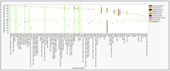 Sensitivity and specificity of panels of epigenetic biomarker detectable in urine and feces and diseases of diagnostic interest. Percent sensitivity and specificity reported in studies (n = 95) are color-coded by disease type (n = 9) that screened each epigenetic biomarker panel * in liquid biopsy of urine and feces. Bars highlighted in green represent biomarker panels and individual biomarkers with the highest sensitivity and specificity given cancer type or replicability. * Panel “SALL3, CFTR, ABCC6, HPR1, RASSF1A, MT1A, RUNX3 … etc.” also includes biomarkers ITGA4, BCL2, ALX4, MYOD1, DRM, CDH13, BMP3B, CCNA1, RPRM, MINT1, and BRCA1 in the full panel.