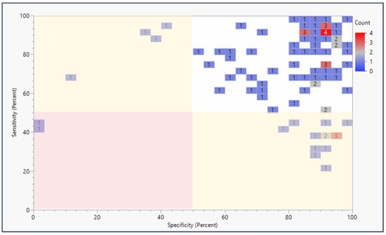The panel with the highest sensitivity and specificity were SOX1, TJP2, MYOD, HOXA9_1, and HOXA9_2 [12], reporting at 100% for both sensitivity and specificity (Figure 2). The panels that were tested in more than one study with the highest sensitivity and specificity included the GDF15, TMEFF2, and VIM panel at 92.5% (95% CI: 96.7–88.3) and 95.0% (95% CI: 109.1–80.9), respectively [13,14]. In addition, the proprietary undisclosed (“unspecified”) panel for the product Bladder EpiCheck reported at 73.1% (95% CI: 101.1–45.2) and 87.4% (95% CI: 89.4–85.5), respectively [15,16,17]. The NDRG4 and BMP3 panel reported 95.2% (95% CI: 103.2–87.1) and 88.3% (95% CI: 93.1–83.5) [8,18]. A test with SEPT9 alone reported 78.2% (95% CI: 92.7–63.6) and 93.3% (95% CI: 96.7–89.9) [19,20]. Finally, the TWIST1 and NID2 panel reported 76.1% (95% CI: 101.1–51.1) and 79.4% (95% CI: 106.2–52.5) [21,22,23,24,25,26].