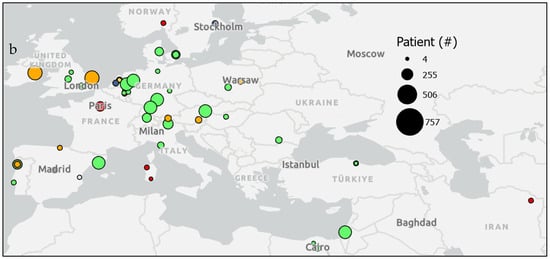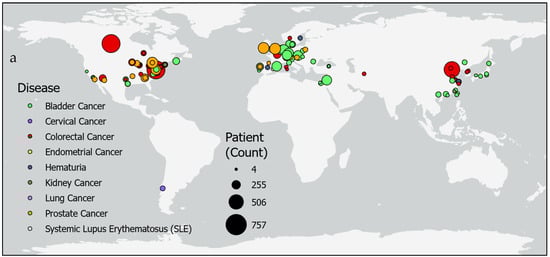 Urine or fecal epigenetic biomarker panel study patient counts by location. Maps show patient counts (sized circles) in epigenetic biomarker panel screening studies of various diseases (colors) (a) globally and (b) in regions in Europe and the Middle East.