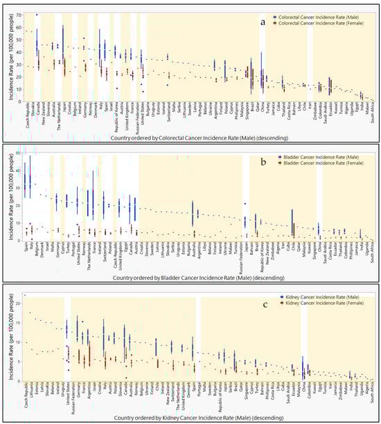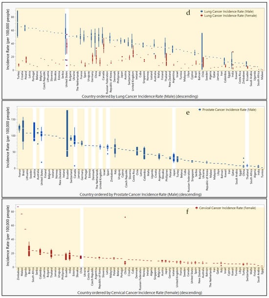 Countries ranked by cancer incidence compared to urine or fecal epigenetic biomarker panel study locations. Box and whisker plots ranked in descending order by cancer incidence rates (per 100,000 people) for (a) colorectal, (b) bladder, (c), kidney, (d) lung, (e) prostate, and (f) cervical cancers. Male (blue) and female (red) incidence rates are separated and color-coded. Orange highlight bars indicate countries that are lacking representation in urine or fecal epigenetic biomarker panel studies for each disease. Countries not highlighted are represented in urine or fecal epigenetic biomarker panel studies identified in this review.
