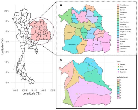 Sampling location for this experiment. (a) Twenty provinces in northeast Thailand. Samples were not collected from Amnat Charoen and Buriram. (b) Forty-six sites from four plants: Cassava (red), rice (green), rubber tree (blue), and sugarcane (purple). Eighteen province sampling sites that covered eight zones represented by different colors: zone 1 (light red), zone 2 (light gold), zone 3 (light lime green), zone 4 (light green), zone 5 (light turquoise), zone 6 (light cyan), zone 7 (light magenta), and zone 8 (light pink).