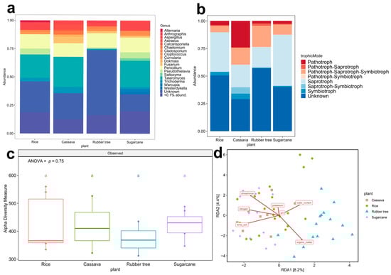 The fungal abundance from four plant fields. Zone 2 (Phu Wiang). (a) Fungal trophic composition (<0.1% abund. = <0.1% relative abundance) from 801 ASVs; there were 18 ASVs (genus) with a relative abundance exceeding 1 percent. The minor but diverse ASVs (<1%) represented 783 ASVs. (b) Fungal taxonomic composition based on the genus level; different colors indicate eight trophic modes. The unknown means unavailable ASVs ecological function in the database. (c) Alpha diversity observed with different colors indicated four plant fields: rice (red), cassava (green), rubber tree (blue), and sugarcane (purple). Tukey HSD significant differences (p < 0.05) are indicated by different letters. (d) Beta diversity analysis by using RDA of zone 2, zone 5 (Udon Sakon Nakon), and zone 6 (Bueng Kan).