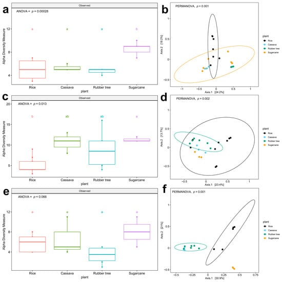 Boxplots show alpha diversity (richness) and beta diversity (PCoA) of WHO FPPL pathogens in the genus level as ASV. Richness in different plant fields: (a) zone 2 (c) zone 5, and (e) zone 6. Different colors indicate four plant fields: rice (red), cassava (green), rubber tree (blue), and sugarcane (purple). Boxplots show the 25th and 75th percentile, while the median is shown as lines inside the boxes, and Tukey HSD significant differences (p < 0.05) are indicated by different letters. Principal Coordinate Analysis in (b) zone 2, (d) zone 5, and (f) zone 6. Different colors indicate four plant fields, including black for rice, blue for rubber tree, green for sugarcane and yellow for cassava. Significant differences among zone 2, zone 5, and zone 6 (PERMANOVA; p < 0.05) were shown on PCoA.