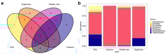 WHO FPPL pathogen distribution from four plant fields in zone 2. (a) Venn diagram with different colors of plant fields: rice (yellow), sugarcane (orange), rubber tree (purple), and cassava (dark blue). (b) Taxonomy composition based on genus level.