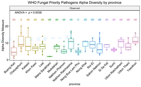 Alpha diversity of WHO FPPL pathogens in 18 provinces of northeast Thailand. Boxplots show the 25th and 75th percentile, while the median is shown as lines inside the boxes. Tukey HSD significant differences (p < 0.05) are indicated by different letters.