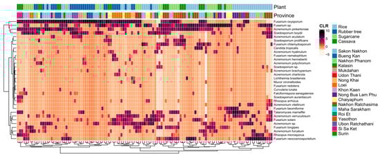 Heatmap based on the centered log-ratio (CLR) transformed values of the 32 selected fungal species of the WHO FPPL distributed in eighteen provinces in four plant fields. Plant fields present rice (light blue), rubber tree (dark blue), sugarcane (light green), and cassava (dark green).