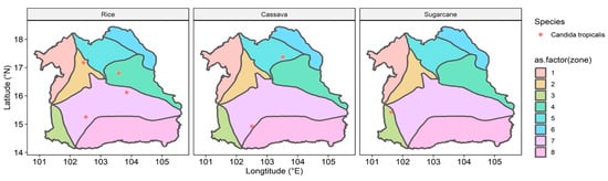 Location of Candida tropicalis detected in all zones of the northeastern region of Thailand in rice, cassava, and sugarcane fields. Zonation colors: zone 1 (light red), zone 2 (light gold), zone 3 (light lime green), zone 4 (light green), zone 5 (light turquoise), zone 6 (light cyan), zone 7 (light magenta), and zone 8 (light pink).