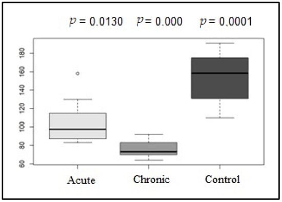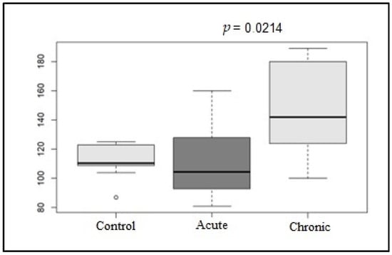 Box plot graphic of the mean HR values (bpm) of the control, acute, and chronic groups on conventional electrocardiogram.