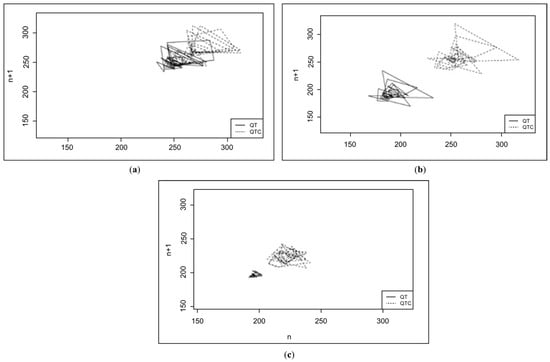 Poincare plot of the dogs in this study: (a) the acute phase of the disease group (G1), with TI = 14.36; (b) the chronic phase of the disease group (G2), with TI = 11.69; (c) the control group, with TI = 5.84.