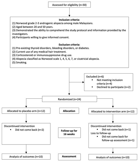 Following sample size recommendations, a minimum of 10 participants per group were required for this pilot randomized trial [16]. To minimize the confounding variables, strict exclusion criteria were applied. Participants were excluded if they had pre-existing thyroid disorders, bleeding disorders, or diabetes, were currently using any medical hair treatments, were on corticosteroids or immunosuppressive drugs, or had alopecia classified as Norwood scale 1, 4, 5, 6, 7, or cicatricial alopecia. Additionally, individuals who smoked were deemed ineligible (Figure 1).