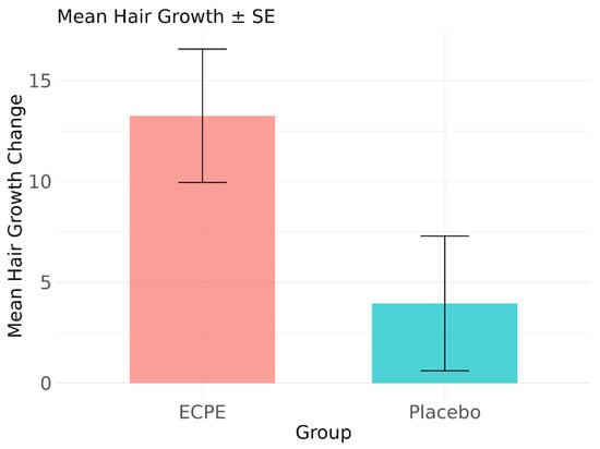 Comparison of mean hair growth changes between treatment groups. Bar chart showing mean change in hair growth from baseline to week 16 for ECPE and placebo groups. Error bars represent standard error of mean (SE).