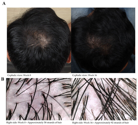 (A) Camera photos of the cephalic view of a participant treated with ECPE at weeks 0 and 16, and (B) trichoscopic images of the right side of the scalp of the same participant at weeks 0 and 16.