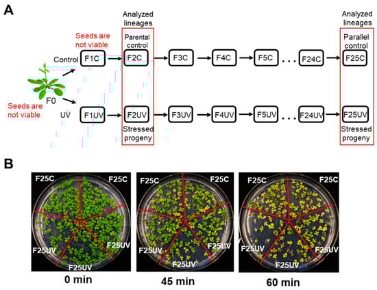 Arabidopsis seeds used as starting material representing the parental generation (F0) were obtained from a single homozygous Arabidopsis thaliana (Columbia ecotype, Col-0) plant transgenic for the luciferase (LUC) recombination reporter gene consisting of a copy of a direct repeat of the luciferase recombinant transgene under the control of 35S promoter. The seeds of these plants were grown in 10 × 10 cm pots, 3–4 plants per pot. Two groups of plants were obtained, those propagated without stress, the control group (C), and those propagated under UV-C stress, the stressed group (UV). Control plants were grown at normal growth conditions, with constant humidity of 65%, and with 16 h light, 8 h dark, with the following light conditions: 32.8 μEm−2s−1 of the white light at the wavelength with 2 main peaks of 540 and 610 nm. Plants representing the “UV” group were grown under the same conditions, but at the age of 7 days post germination, they were exposed to UV-C irradiation (G30T8) of 30.5 W and 99 V and UV output of 13.9 W for 2 min daily (at 10 am) for four consecutive days (Figure 1A). All parental plants were grown to flower, and seeds were collected and pooled from approximately 16 to 20 plants per tested experimental line. The seeds were stored under dry conditions at room temperature. All 25 subsequent progeny plants were obtained from these seeds; specifically, ~100 seeds were sown, and ~20 randomly selected plants formed the next generation. Five independent lineages were maintained for 25 generations. There were two lineages of control, and three lineages of stressed plants propagated in a similar manner, representing two experimental repeats of control and three experimental repeats of stressed plants.