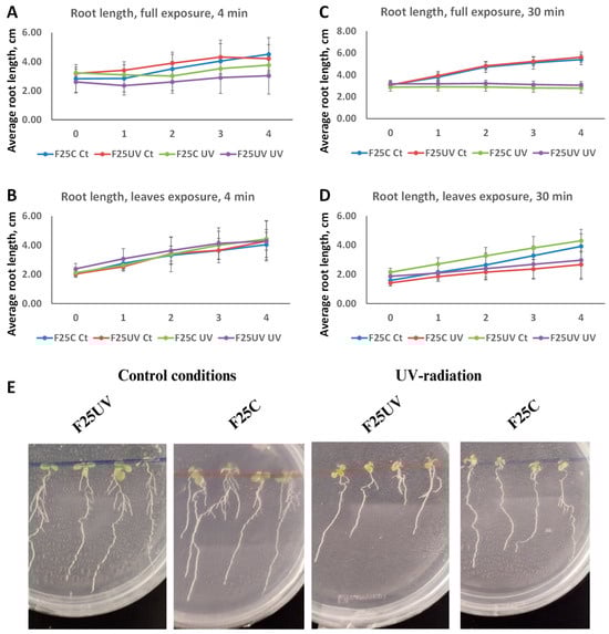 To determine root growth, the F25C and F25UV generations were sown on vertically positioned plates. Whole seedlings or only their leaves were irradiated with UV-C radiation for periods of 4 or 30 min. Root length was measured before and during the subsequent 4 days (Figure 2A,B). UV-C radiation significantly reduced root growth in all cases. Plants subjected to 4 min of UV exposure showed a notable decrease in root length compared to the unexposed. Exposure of the entire plant inhibited root growth more drastically than exposure of leaves alone. However, no significant difference in root development was detected between F25C and F25UV under either control or UV treatment (p > 0.05). After 30 min of exposure, similar results were found (Figure 2C,D).