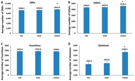 To determine the frequency of occurrence of SNPs and INDELs, we mapped sequencing reads to the TAIR 10 reference genome. The total number of SNPs and INDELs was significantly higher in the F25UV group as compared to two other groups (p < 0.05) (Figure 3A,B). The difference in INDELs was attributed to deletions rather than insertions; there was no difference among the groups in the number of insertions (Figure 3C,D). The F25C group was not different from the F2C group.