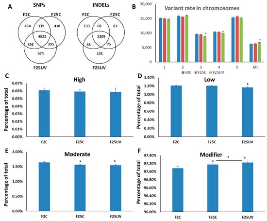 The analysis of SNP uniqueness (A), SNP distribution between chromosomes (B) and potential SNP impact (C–F). (A) Venn diagrams of jointly called SNP and INDEL variants. The non-overlapping area of Venn indicates the number of unique SNPs and INDELs in each sample group. Sample variants were jointly called by the “GATK haplotype caller” using five samples together. (B) Variant rate in different chromosomes is shown as the number of nucleotides per one SNP in each chromosome; Mt—mitochondrial genome. (C–F) Demonstrate the percentage of specific types of SNPs by their impact on gene expression, where “high” (C) has the highest impact on gene expression, protein composition, or/and protein function, while “low” (D) and “moderate” (E) have less of an effect. “Modifier” (F) has the least effect on gene expression. All terms are from SnpEff []. The data are averaged (with SE) from five individual plants. Asterisks over F25C or F25UV show a significant difference from FC (t-test, two-sample assuming unequal variances; p < 0.05). The asterisk over the horizontal bar indicates a significant difference between F25UV and F25C.