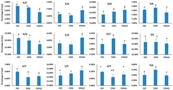 Type of single nucleotide substitutions in F2, F25C and F25UV groups. The Y-axis demonstrates the percentage of mutations among all mutations, while the X-axis shows the three tested groups. Data are shown as an average from five samples ± SE. Letters (a,b) show significant differences (t-test, two-sample assuming unequal variances; p < 0.05). A—adenine, C—cytosine, G—guanine, T—thymine.