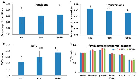 Transitions and transversions in the F2C, F25C and F25UV groups. Percentage of transitions (A), transversions (B) and the ratio of transition to transversion (Ti/Tv) (C) as well as the ratio of Ti/Tv in various genic regions (D). The Y-axis shows either percentage of Ti or Tv (A,B) or the Ti/Tv ratios (C,D), while the X-axis shows the specific group. Data are shown as an average calculated from five different samples, with SE. Letters over the bars show the significant difference (t-test, two-sample assuming unequal variances; p < 0.05) between the groups.
