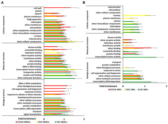 Enrichment of cellular components, molecular function, and biological processes in INDELS (A) and SNPs (B) in F2C, F25C and F25UV groups. The X-axis shows normalized class score with binomial coefficients as calculated by SuperViewer. To calculate enrichment, p-value of <0.05, ±bootstrap SD were used, significance is shown with asterisk. The Y-axis shows cellular components, molecular functions, and biological processes.