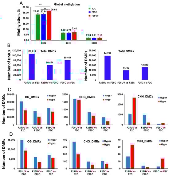 Global methylation changes, differentially methylated cytosines (DMCs) and differentially methylated regions (DMRs) in the F25UV, F25C and F2C plants. (A) The average percentage of methylated cytosines in F2C, F25C, and F25UV in CG, CHG, and CHH sequence contexts (H = A, T, C). Methylation levels were determined from reads with the minimum coverage ≥ 10 mapped to the TAIR 10 reference genome by using Bismark software (version 0.24.2). The data were analyzed by one-way ANOVA with the Tukey’s multiple comparisons test using GraphPad Prism version 8.4.2 for Windows. The data are shown as the average percentage (with ±SD) of methylated cytosines from five individual methylomes in each of the progenies. The asterisks show a significant difference between the stressed progeny and the parental control progeny (** p < 0.05). (B) The total number of DMCs and DMRs in the F25UV vs. F2C, F25UV vs. F25C and F25C vs. F2C comparison groups. (C) The total number of hyper- and hypomethylated DMCs in the CG, CHG and CHH contexts in the F25UV vs. F2C, F25H vs. F25C and F25C vs. F2C comparison groups. (D) The total number of DMRs in CG, CHG and CHH contexts in the F25UV vs. F2C, F25UV vs. F25C and F25C vs. F2C comparison groups.