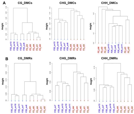 Global methylation clustering of DMCs (A) and DMRs (B) at CG, CHG and CHH context in F25UV vs. F2 comparison. Hierarchical clustering of F25UV vs. F2C using Pearson’s correlation distance. “Height” indicates the distance of split.