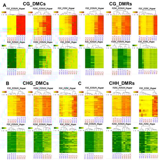 A hierarchical clustering heatmap analysis. Heat maps of DMCs and DMRs for hypermethylated cytosines (the upper panel) and hypomethylated cytosines (the lower panel) in the CG (A), CHG (B) and CHH (C) contexts in the F25UV vs. F2C, F25UV vs. F25C and F25C vs. F2C comparison groups. Differentially methylated cytosines in the genome with differences of >50% in F25H vs. F2C. In the upper panel, the red section indicates the larger percentage of methylation, and the yellow section indicates the lower percentage, and in the lower panel, the green section indicates the larger percentage of methylation, and the yellow one indicates the lower percentage, q-value < 0.01.