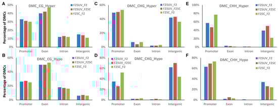 The distribution of hyper-and hypomethylated DMCs in the genic and intergenic regions in F25UV vs. F2C, F25UV vs. F25C and F25C vs. F2C comparison groups. (A) Distribution of hypermethylated CG DMCs. (B) Distribution of hypomethylated CG DMCs. (C) Distribution hypermethylated CHG DMCs. (D) Distribution hypomethylated CHG DMCs. (E) Distribution of hypermethylated CHH DMCs. (F) Distribution of hypomethylated CHH DMCs.