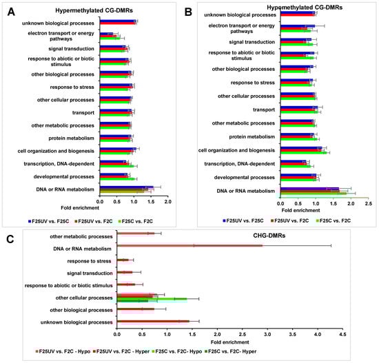 When similar analysis was performed in the CHG and CHH contexts, we found a large fraction of DMCs in the promoter or intergenic regions. For hypomethylated CHG, a drastic difference was found for DMCs in the intergenic regions; there were over ~20% more DMCs in the F25UV comparison groups as compared to the F25C vs. F2C comparison groups. The opposite was observed for promoter regions—F25UV comparison groups had a lower percentage of hypomethylated DMCs as compared to F25C vs. F2C group (Figure 12D). In the CHH context, there was the decrease in the hypermethylated and hypomethylated cytosines in the promoter region in the F25UV as compared to F25C and F2C groups, and the increase in the intergenic region (Figure 12E).