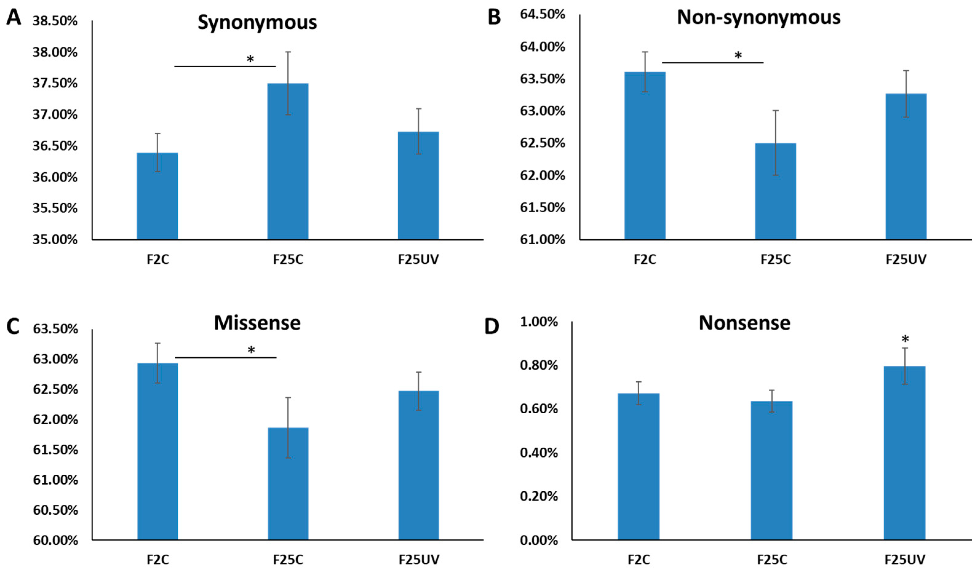We also analyzed SNPs in categories of synonymous and non-synonymous mutations, with further categorization of non-synonymous mutations into missense and nonsense mutations. There was a significantly higher percentage of synonymous and a significantly lower percentage of non-synonymous mutations in F25C as compared to F2C (p < 0.05) (Figure 5A,B). The F25C group had a lower percentage of missense mutations as compared to the F2C group, while the F25UV group had a significantly higher percentage of nonsense mutations than either the F2C or F25C groups (Figure 5C,D).