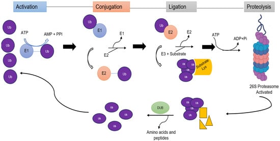 For the ubiquitination process to occur, the activity of several actors is required in a three-step sequential manner: first, a Ub molecule is activated by the activating enzyme or E1 in an ATP-dependent manner; then, a conjugating enzyme or E2 transports the Ub to the substrate protein; and, finally, it culminates in the formation of an isopeptide bond between the terminal α-carboxyl group of Ub and the ε-amino group of a lysine (K) present in the target protein, a function carried out by E3 ligases [10,19] (Figure 1).