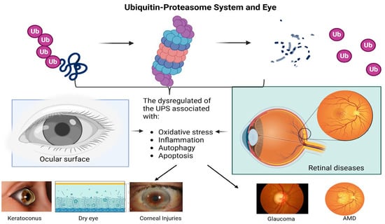 The UPS regulates key biological processes such as inflammation, oxidative stress, and cell death. Its dysfunction could be involved in anterior segment ocular diseases, such as dry eye and keratoconus, which are associated with chronic inflammation and abnormal protein degradation. In the posterior segment, the UPS may influence conditions such as glaucoma and age-related macular degeneration (AMD), where impaired protein degradation and stress response contribute to disease progression.