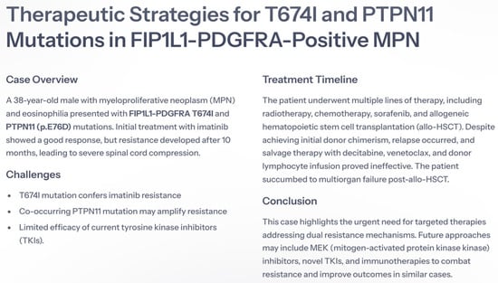 An overview of therapeutic challenges and treatment strategies for a patient with FIP1L1-PDGFRA T674I and PTPN11-mutated myeloproliferative neoplasm. The figure summarizes the patient’s disease progression, resistance to tyrosine kinase inhibitors, treatment responses, and post-transplant outcomes.