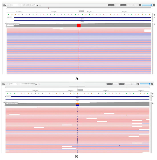 IGV images from the NGS panel results showing mutations in (A) the PDGFRA gene (p.T674I) and (B) the PTPN11 gene (p.E76D). Abbreviations: IGV, Integrative Genomics Viewer; NGS, Next-Generation Sequencing; PDGFRA, Platelet-Derived Growth Factor Receptor Alpha; PTPN11, Protein Tyrosine Phosphatase Non-Receptor Type 11.