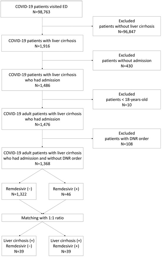 From the CGRD, we collected data of patients with COVID-19 who had visited our emergency department between April 2021 and September 2022. All COVID-19 diagnoses were confirmed through polymerase chain reaction (PCR) testing. Patients with liver cirrhosis were identified based on the International Classification of Diseases, Tenth Revision, Clinical Modification (ICD-10-CM) codes for cirrhosis recorded in the outpatient setting within the three months prior to their ED visits. The ICD-10-CM codes used were as follows: K703, K7030, K7031, K717, K74, K743, K744, K745, K746, K7460, K7469, and P7881. We excluded patients without liver cirrhosis, those under 18 years of age, those not requiring hospitalization, and those with a “do not resuscitate (DNR)” order. The basic demographic data included information on age, sex, initial vital signs, laboratory results, and underlying medical conditions. The model for end-stage liver disease (MELD) and WHO ordinal severity scale scores were calculated; in addition, the WHO inflammation risk categories were explored [38,39,40]. We developed a 5-point scale based on radiographic lung images to assess disease severity based on radiologists’ reports. Direct radiographic image evaluation was not possible because our database was de-identified and the images were unavailable. We analyzed the treatment regimens and outcomes—that is, including length of hospital stay (LOS), mortality rate, intubation rate, and intensive care unit (ICU) admission. Patients were stratified into two groups on the basis of remdesivir use.