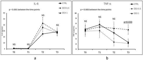 Comparison of IL-6 (a) and TNF-α (b) concentrations between groups across different time points (T0—hospital admission, T1—prior to CPB initiation, T2—5 h after CPB discontinuation, T3—12 h after CPB discontinuation). Plasma concentrations of IL-6 and TNF-α were measured using enzyme-linked immunosorbent assay (ELISA). Data are presented as the mean ± standard error of the mean (SEM). NS—not significant. Differences between groups and the effects of time were assessed using repeated measures ANOVA.