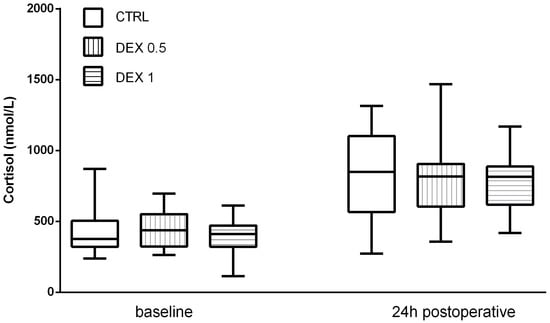 Cortisol levels at baseline and 24 h postoperatively. Data are presented as median, interquartile range with the minimum and maximum values.