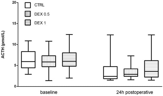 ACTH levels at baseline and 24 h postoperatively. Data are presented as median, interquartile range with the minimum and maximum values. ACTH—adrenocorticotropic hormone.