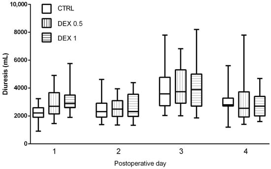 While the diuresis values showed an increasing trend in dexmedetomidine-treated groups on postoperative days (POD) 1, 2 and 3 (Figure 4), these differences did not reach statistical significance (p = 0.075). GFR remained stable across groups, and no significant differences were found in creatinine and urea levels, indicating no adverse renal effects associated with dexmedetomidine administration (Table A1, Table A2, Table A3 and Table A4).
