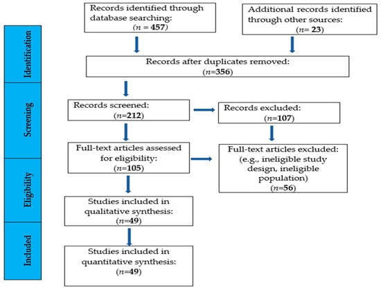 A total of 457 articles were identified through database searches, with an additional 23 articles retrieved from reference lists. After removing duplicates and screening titles and abstracts, 212 studies remained. Two researchers independently evaluated these studies, and following the final screening, 49 studies were included in the systematic review. Further details on the selection process are provided in Figure 1.