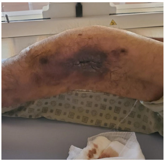 At the time of admission, the physical examination revealed a marked deformity of the thigh, with a necrotic area on the outer side of the left thigh. There is a skin defect approximately 4–5 cm in size, with irregular edges and atonic tissue, along with the secretion of a serosanguinous fluid (Figure 1).