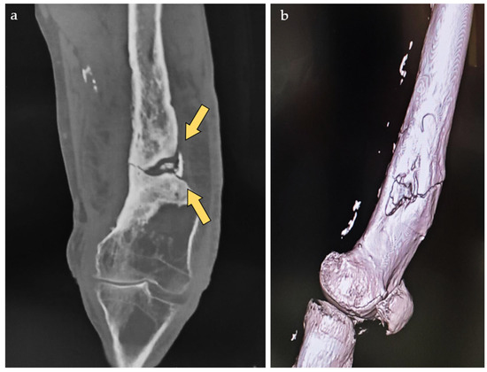Preoperative CT scan with reformatting in the coronal plane (a) and virtual rendering technique (b) depicting the non-united fracture (yellow arrows).