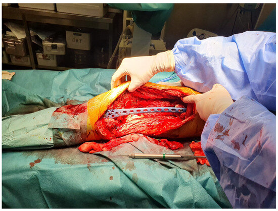 After debridement and excision, the second step involves stabilizing the limb to maintain length, alignment, and positioning prior to the insertion of the cement spacer. The choice of osteosynthesis method depends on the location of the defect. While an external fixator is typically used for stable fixation in most cases, a titanium plate was chosen in this instance due to the specific characteristics of the case (Figure 4).