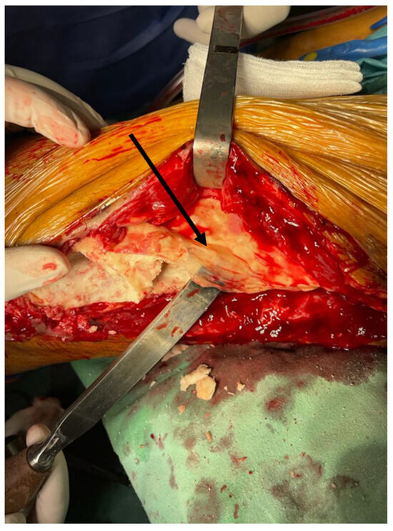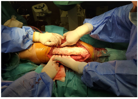 The second stage involved the removal of the cement spacer and the harvesting of an autologous bone graft to fill the remaining cavity. The process began with a single central longitudinal incision through the self-induced bioactive membrane. Intraoperatively, the membrane appeared white-yellowish, and both the fibrous and well-vascularized structures were visible (Figure 8). Its consistency was firm yet malleable, sufficient to maintain a cavity for the bone autograft. The spacer was removed in smaller fragments using a saw or osteotome.