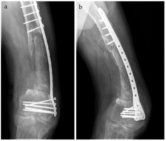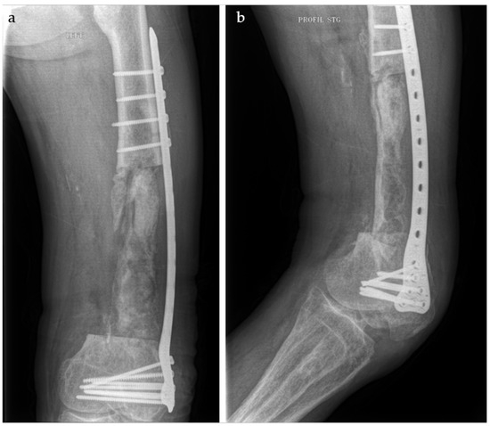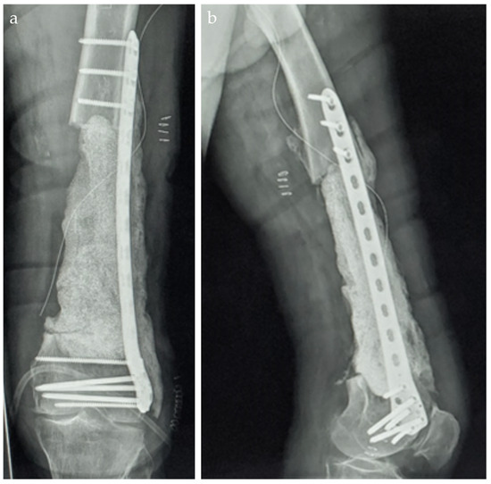 - Botterill, J.; Ghosh, S.; Bhaskaran, A. Pathological Fracture of the Femur Following Chronic Osteomyelitis: A Case Report of This Rare Presentation in Adults. Cureus 2024, 16, e59733. [Google Scholar] [CrossRef]